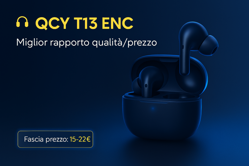 Le QCY T13 ENC sono le cuffie economiche più vendute e più apprezzate del 2026. Offrono un audio pulito, bassi presenti e un’autonomia che supera tranquillamente una giornata intera. Ottime anche per chiamate grazie alla tecnologia ENC.